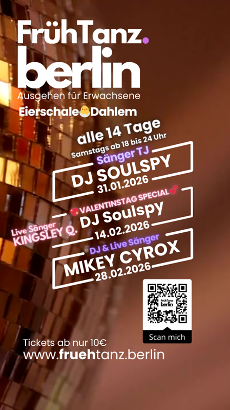 Veranstalter ist unserer Kooperationspartner FrühTanz Berlin, die Eierschale Dahlem ist nur Veranstaltungsort und nicht verantwortlich. Mehr Infos unter https://fruehtanz.berlin